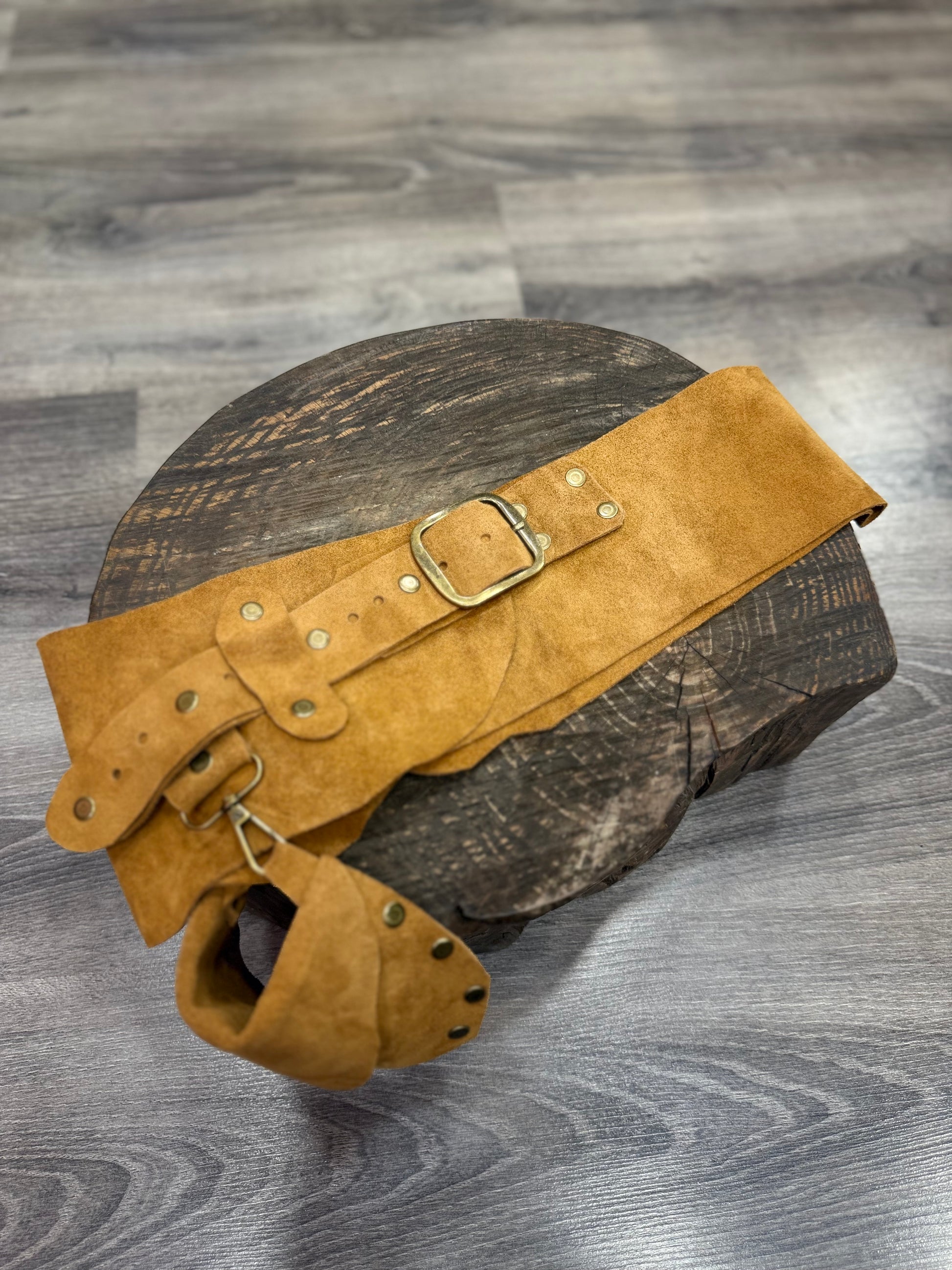 Honey Buck Nubuk Hakiki Deri El Yapımı Kemer, bal–amber tonlarındaki nubuk yüzeyi ve doğal mat dokusuyla sıcak ve bohem bir stil sunar. Western tokası, el işçiliğini yansıtan dikiş çizgileri ve rustik detayları ile modern bohem tarzı vintage bir hava ile birleştirir.