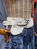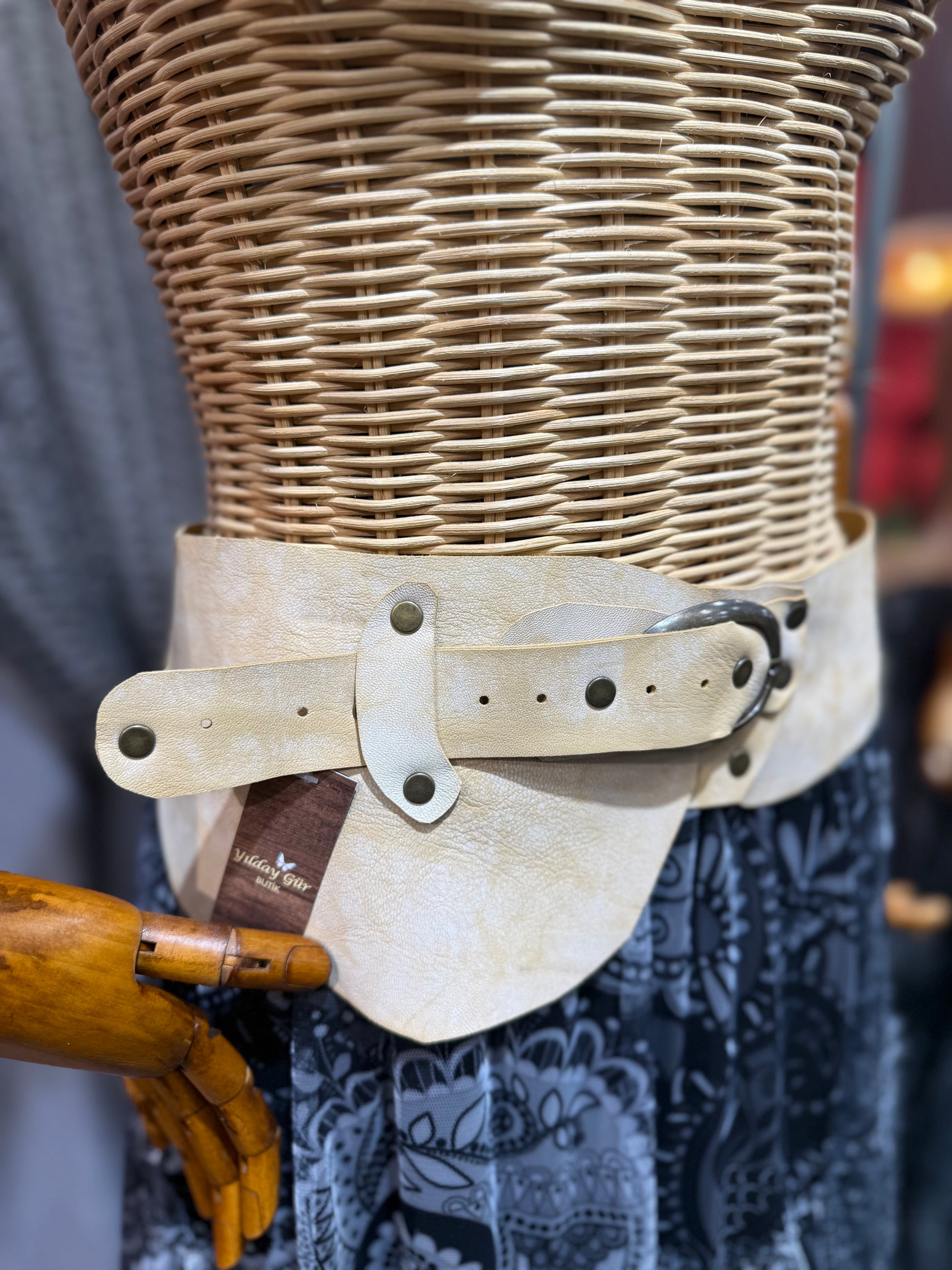 Agatha Deri Kemer, kum tonlarındaki hakiki deriden el işçiliğiyle üretilmiş sade ama güçlü bir bohem bel kemeridir.